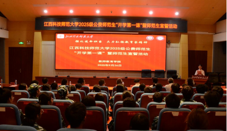 紧接着,全体2025级公费师范生进行了庄严的师范生宣誓。“我志愿成为一名人民教师,忠诚党的教育事业……”铿锵有力的誓言回荡在报告厅内,表达了同学们立志成为一名光荣的人民教师、为祖国教育事业贡献力量的坚定决心。